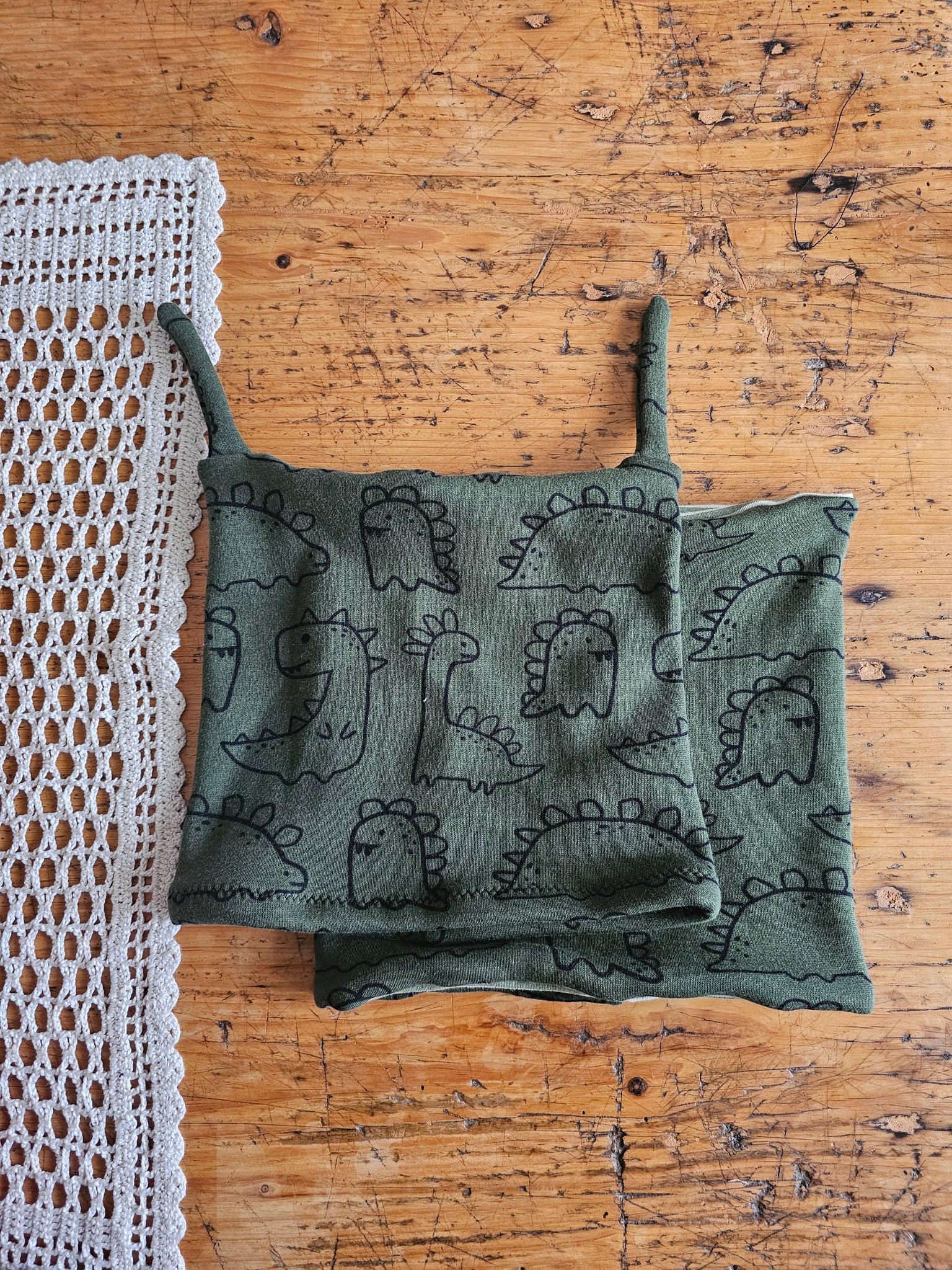 Berretto orecchielunghe/scaldacollo oppure completo da bambino in pile da montagna, fantasia dinosauri