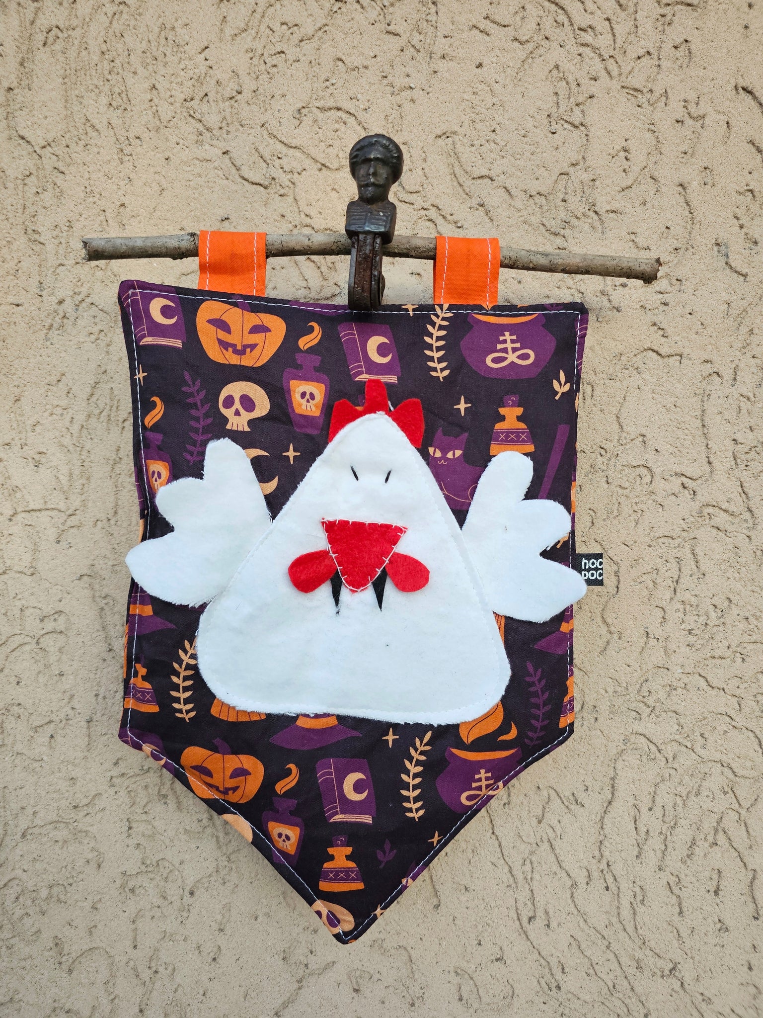 La decorazione è realizzata a forma di bandierina imbottita con applicazione in pannolenci. I fiori, gli occhi e la bocca sono realizzati e cuciti a mano.